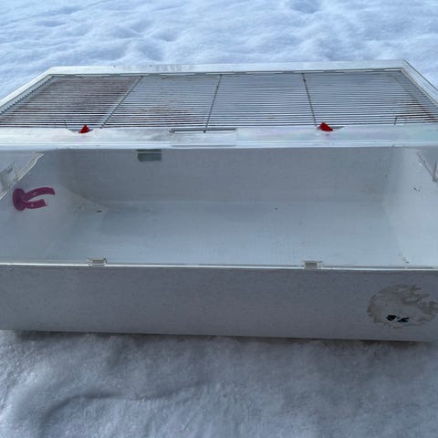 Ikean samla, ollut käytössä kääpiöhamsterilla. Kanteen tehty aukko ja siinä päällä ritilä jota kautta ilma pääsee kulkemaan.