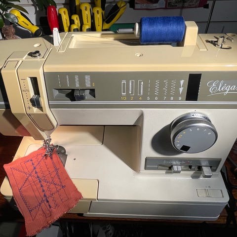 Kuvissa näkyy erilaisia ommelvaihtoehtoja koeommeltuna kankaalle.