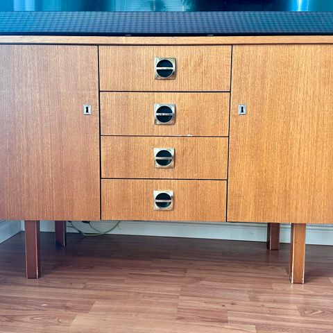 Lahden puukalusteen (nykyisin Isku) 50-60 luvun Tiikki viilu pintaisesta kirjahyllystä tehty senkki.