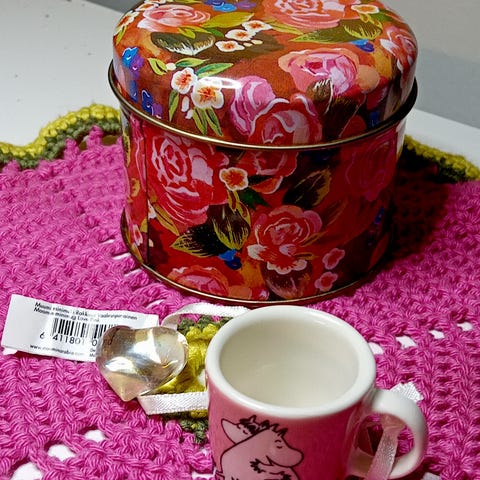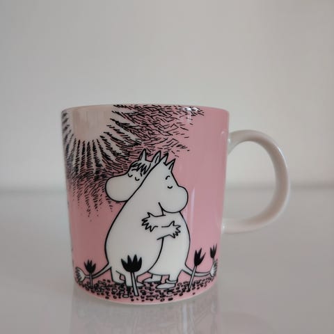 Minikokoinen muumimuki Rakkaus violetti. Suloinen koriste-esine. Tullut uutena minulle ja ollut sen jälkeen vitriinissä koristeena.