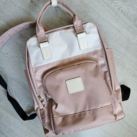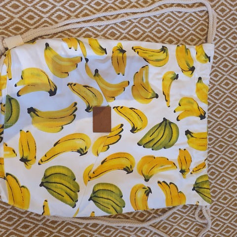 Myydään kankainen narureppu. Edessä pieni vaalean harmaa tahra. Lähtenee puhdistamalla.