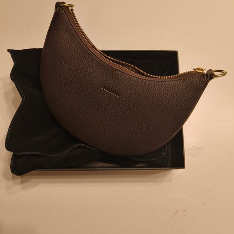 Aarnin Luna nahkainen tummanruskea olkalaukku naisille. Puolikaaren muotoinen laukku, jossa irrotettava ja säädettävä olkahihna. Laukussa on vetoketjusuljenta ja kullanväriset metalliosat. Soveltuu päivittäiseen käyttöön ja pienten tavaroiden kuljettamiseen. Laukku uudenveroinen. Puhdas sisältä sekä ulkoa. Laukun sisällä reilu vetoketju tasku.