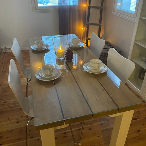 Mallina ollut tamminen laadukas ruokapöytä puujalalla.