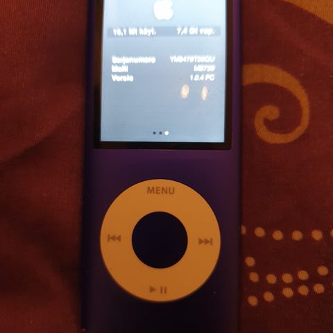 Apple iPod Nano MP3-soitin, tallennustila 8 GB. Akku on tässä loppu eli toimii vain kytkettynä verkkoon.