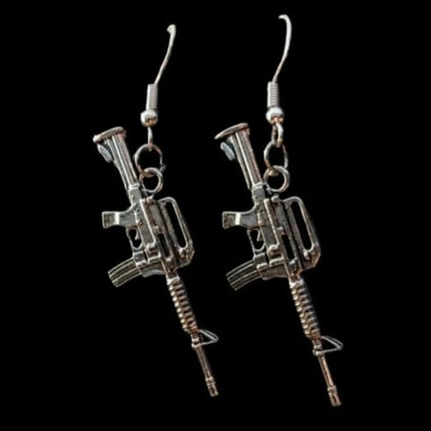 - Hauskat hopeiset korvakorut, jotka näyttävät siltä, että revolveri menee korvalävistyksen läpi. Todellisuudessa korvan läpi menevä osa on yhtä kapea, kuin normaaleissakin korvakoruissa, katso lisäkuvat!