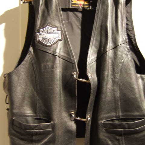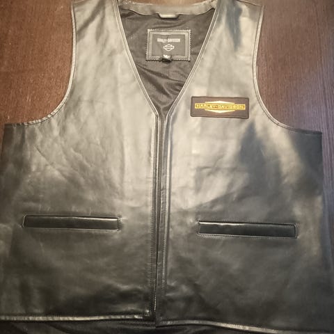 Musta Cobran nahkaliivi Harley Davidsonin merkillä varustettuna. Kolme taskua, joista 2 etupuolella, 1 syvä povitasku sisäpuolella, kaikki ehjiä. Musta vuori. Käytön jälkiä ja kulumaa, vuoria paikattu. Selässä jonkin merkin purkujälkiä ulkopuolella, joista sik-sakit jätetty Cobran sisämerkin päälle.