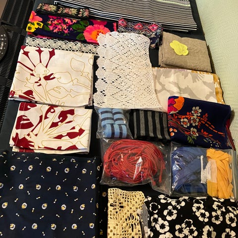 Kasa kangaspaloja ja tilkkuja. Isoimmat palat esim 100 x 50 cm ja pienimmät tilkut 10 x 20 cm, on suorakaiteen muotoisia, mutta paljon epämääräisen muotoisia leikkuusta yli jääneitä tilkkuja. Materiaalina kaikkea mahdollista, puuvillaa, kuviopuuvillaa, vuorikankaita, pellavatilkkuja ja trikoopaloja ym. Määrä on niin paljon kuin peruspakettiin mahtuu : )