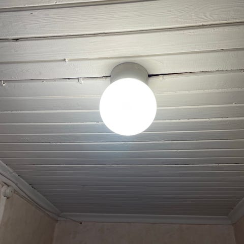 Seinään kiinnitettävä pallovalaisin. Lasi kupua (IITTALA), kantaosa posliinia, jossa jonkin verran maalia.