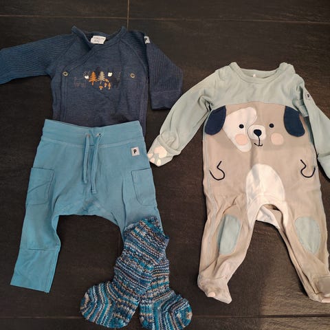 Polarn o. Pyretin harmaat housut ja valkoinen Sanettan body koossa 56 / 1-2kk. Hyvä käytetty kunto.
