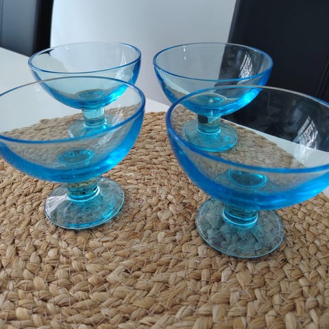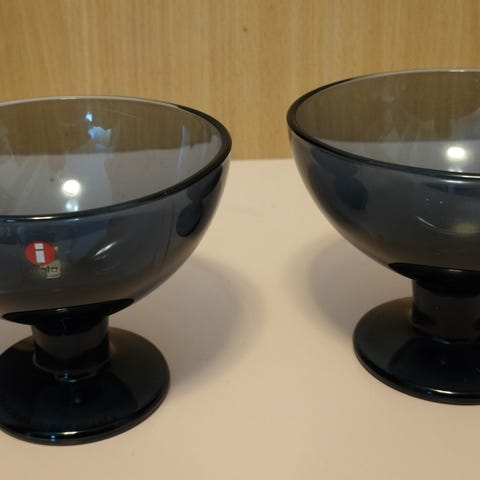 Kaksi Iittalan Verna jälkiruokakulhoa. Värinä sinivihreä. Jalallinen, sopii myös tarjoiluun.