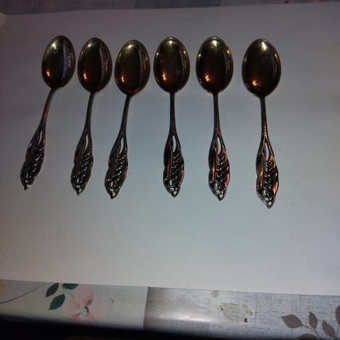 Kuvan mukainen satsi uushopeaa olevat lusikat, haarukka ja kakkulapiot. Kahvilusikka 6 kpl, ei tietääkseni käytetty koskaan.