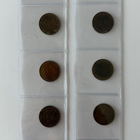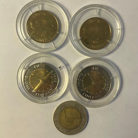 Suomi 5 markkaa kolikot, yhteensä 10 kappaletta. Kolikot vuosilta 4*1973, 1974 3*1979, 1981 ja 1984. Myydään kaikki kerralla. Mieluiten nouto Turusta, mutta myös lähetys on mahdollinen ostajan piikkiin.