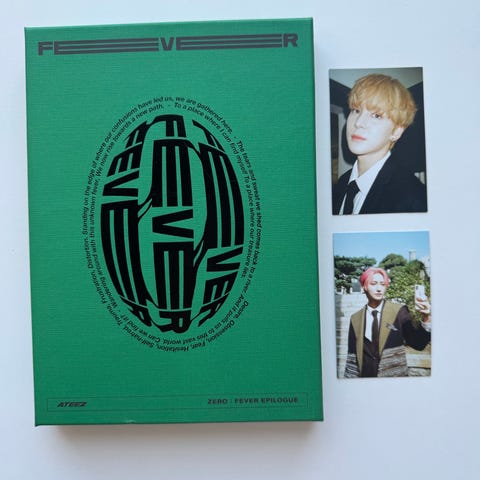 Ateez The World EP2: Outlaw albumi. Pakettiin kuuluu fyysinen CD-levy, albumin kansipakkaus sekä useita oheismateriaaleja, kuten photocard‑kortteja, tarroja ja kuvakortteja. Tuote on korealaisen K-pop-yhtyeen Ateezin julkaisu, jossa on visuaalinen teema violeteilla ja mustilla graafisilla elementeillä.