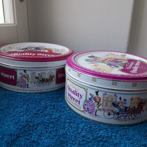 Ahmad Tea peltirasiat, punainen ja sininen. Punaisessa purkissa on englantilaisen puhelinkopin kuva ja teksti English Afternoon Tea. Sinisessä purkissa on englantilaisia hahmoja ja teksti English Breakfast Tea. Pienikokoiset neliönmuotoiset purkit irtonaisilla kansilla soveltuvat esimerkiksi teen, mausteiden tai pienten tavaroiden säilytykseen ja koristekäyttöön. Korkeus ilman kantta 6 cm.