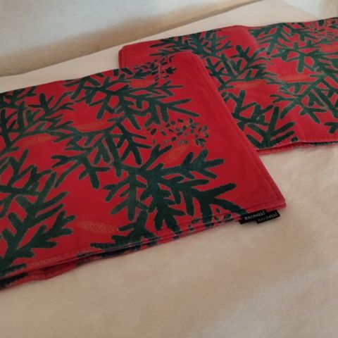 Myydään Marimekon vahakangastabletit. Ollut käytössä lasitetulla parvekkeella ja toinen puoli on haalistunut auringosta. Kuva molemmista puolista.