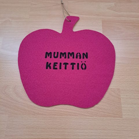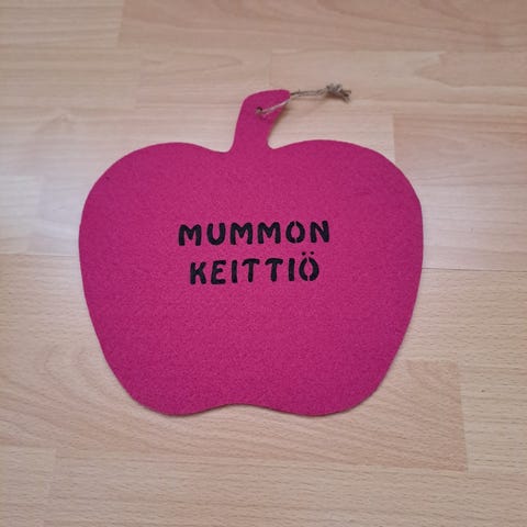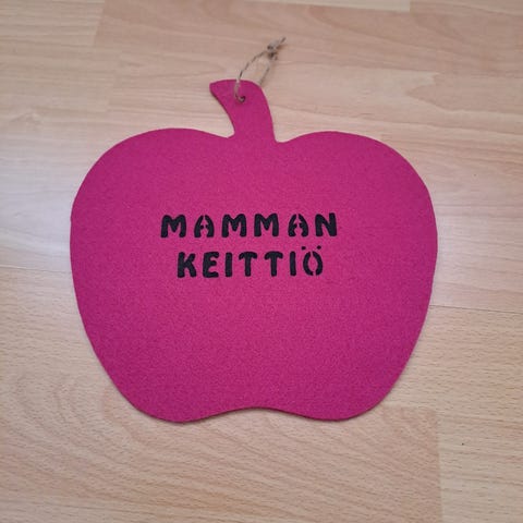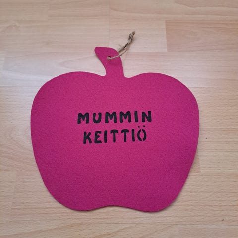 Uusi huovasta tehty omena pannunalunen, käsinpainettu koira kuva.