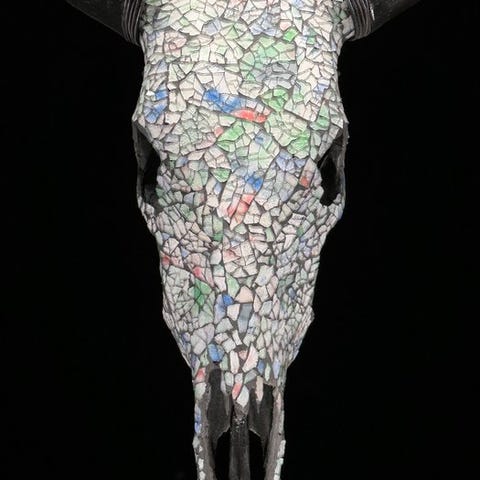 Lasin peittämä lehmän pääkallo. Kallo on kokonaan käsin koristeltu suurella huolella. Se on epätavallinen koristeesine.Noinmiten mitatPituus: 51 cmLeveys: 49 cmHUOM:Olemme lisänneet kuvia käsityöläisistämme työssään antaaksemme kuvan siitä, miltä mosaiikkikuoren luomisen prosessi näyttää.Ole hyvä ja huomaa, että nämä kuvat on otettu hämärässä studiosta, ja värit voivat vaihdella ympäristön mukaan.Teline ei sisälly.Paino, joka mainitaan, sisältää pakkausmateriaalin.VastuuvapauslausekePäähän on kiinnitetty kiristysnarusta, jotta se voidaan kiinnittää seinälle.Sarvet irrotetaan kuljetustarkoituksiin ja ne on helppo kiinnittää uudelleen. Sarvet on aina pakattu laatikon pohjalle, kallon alle. Varmistathan, että poistat sarvet ennen pakkauksen hävittämistä.- Koska kyseessä on luonnollinen kallo, siinä saattaa olla joitakin luonnollisia pieniä halkeamia, uurteita tai puuttuvia hampaita. Tämä on normaalia. Katso kuvat viitteeksi.- Kallomme puhdistetaan ammattilaisvoimin, mutta joskus hampaissa voi esiintyä pieniä värjäytymiä. Tämä on luonnollista ja normaalia, eikä siihen voida paljoa vaikuttaa. Katso kuvat.LähetysKohde lähetetään seurantanumerolla DHL Parcelin, DPD:n tai postNlin kautta. Seuranta päivittyy Catawiki-luettelossasi, kun pakettisi on jätetty postiin.Ole hyvä ja tarkista säännöllisesti välttääksesi pakettisi palautumisen meille, jolloin ostaja vastaa toisen lähetyksen toimituskuluista.Seurantaan Espanjaan ja Portugaliin käytä tätä linkkiä ja lisää Catawiki-erästäsi saatu seurantanumero.https://clientesparcel.dhl.es/LiveTracking/HomeEMME YHDISTÄ TOIMITUKSIA!!!- Jos sinulla on kysyttävää paketistasi, ota yhteyttä meihin Catawiki-viestipalvelun kautta. Yritämme vastata kolmen työpäivän kuluessa.