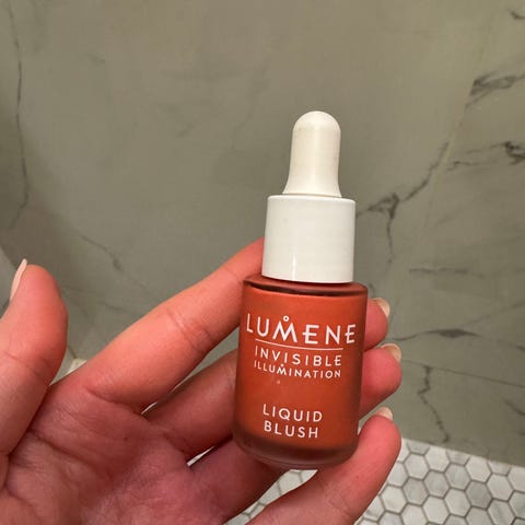 Laadukas Lumene Invisible Illumination liquid blush Pink Blossom -nestemäinen poskipuna pipettipullossa. Sävy on Pink Blossom, vaaleanroosanpunainen sävy.