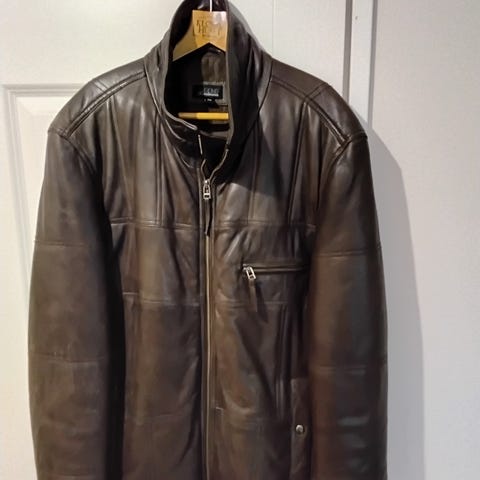 Outdoor talvitakki, koko 52. Ruskea nahkainen päällinen ja vaalea, paksu vuori. Malli muistuttaa lentäjätakkia, jossa on korkea kaulus, solkikiinnityksiä ja säädettävät hihnat helmassa. Edessä kaksi taskua. Takki soveltuu kylmiin säihin. Kulumajälkiä ja repeämä näkyvissä nahkapinnassa, kuten kuvissa.
