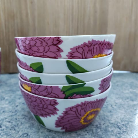 Marimekon Primavera setti, jossa 19,5cm lautanen, 14cm kulho ja muki.