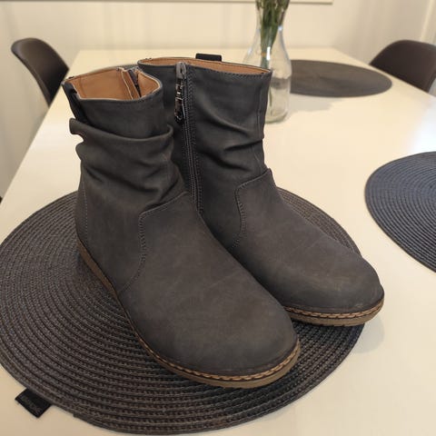 Vähän käytetyt tekonahkaiset mustat nilkkurit, koko 38, pehmeät jalassa, sisäpuolella ohut karvavuori. Korko n.5cm. Merkki soft comfort.