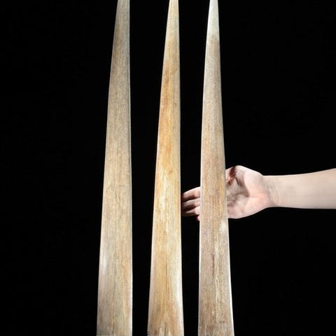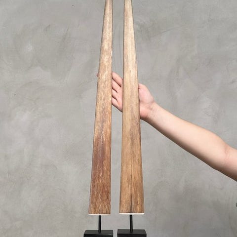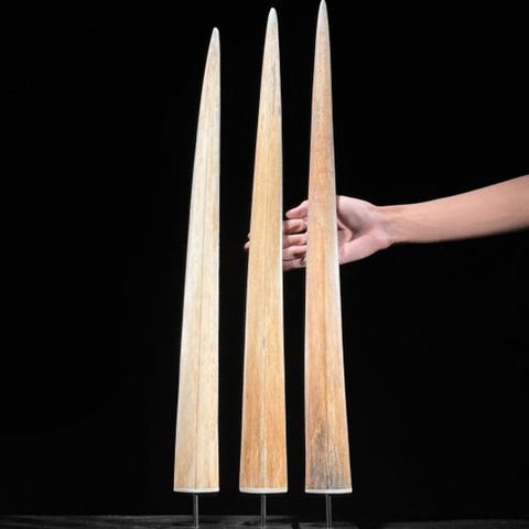 Pari miekkakalojen hampaita on kiinnitetty räätälöityihin jalustoihin, ja miekkakalojen kuonon pohja sekä halkeamat on täytetty vaaleanbeige-sävyisellä epoksilla.Vangittu Indonesiassa. Tällaisia hampaita käytettiin aseiden valmistukseen.Todella koristeellinen esine.Noin mitat, mukaan lukien jalusta.Korkeus 1: 77 cmKorkeus 2: 69 cmVastuunrajoitukset- Koska kyseessä on luonnollinen tusk, siinä saattaa olla joitakin luonnollisia pieniä halkeamia ja uurteita. Tämä on normaalia. Katso kuvat ohjeeksi.Meidän torahampaimme puhdistetaan ammattilaisella, mutta joskus pieni värjäytymä voi silti esiintyä. Tämä on luonnollista ja normaalia, eikä siihen voi paljon vaikuttaa. Katso kuvat.Yksi tai useampi kuva esittää tyyliteltyä esinettä. Tarkat tiedot myytävästä esineestä löytyvät muista kuvista. Tyylitellyssä kuvassa olevat esineet eivät sisälly myyntiin.Paino, joka mainitaan, sisältää pakkausmateriaalin.LähetysKohde lähetetään seurantanumerolla DHL Parcelin, DPD:n tai postNlin kautta. Seuranta päivittyy Catawiki-luettelossasi, kun pakettisi on jätetty postiin.Ole hyvä ja tarkista säännöllisesti välttääksesi pakettisi palautumisen meille, jolloin ostaja vastaa toisen lähetyksen toimituskuluista.Seurantaan Espanjaan ja Portugaliin käytä tätä linkkiä ja lisää Catawiki-erästäsi saatu seurantanumero.https://clientesparcel.dhl.es/LiveTracking/HomeME EMME YHDISTÄ TOIMITUKSIA!!!Jos sinulla on kysyttävää paketistasi, ota meihin yhteyttä Catawiki-viestipalvelun kautta. Pyrimme vastaamaan kolmessa työpäivässä.