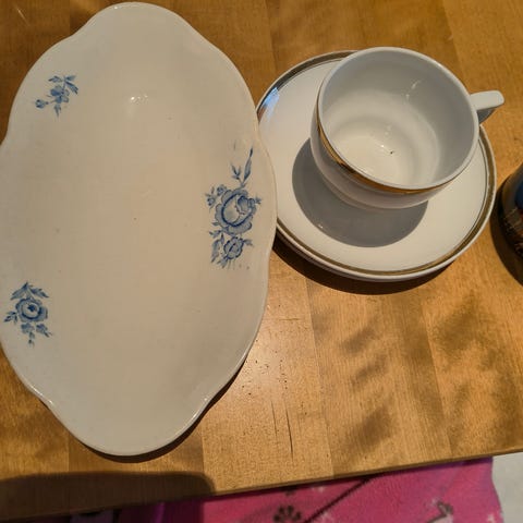 Ihana sininen Ruusu -kuvio. Kupissa on pientä valmistuksenaikaista nypylää sisällä ja ulkopuolella, mutta yleisilme on siisti ja lasite ehjä. Pohjarenkaassa on vähän väriä, jota en ole koittanut pyykiä pois. Astia on ollut kaapissa hyvin kauan aikaa.
