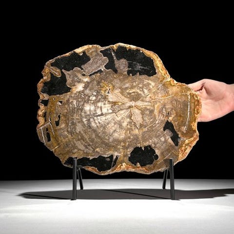 Häikäisevä kivettyneen puun viipale omalla jalustallaan. - Kivettynyt puu ()