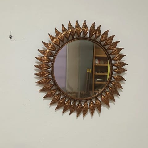Upea peili. Kullankeltainen. Peippojen sulat - pauwenveren. Erittäin kaunis muotoilu. Hartsinen kehys. Mitat ovat seuraavat (+/-):Korkeus: 48 cmLeveys: 48 cmKaikki tuotteemme pakataan hyvin ja lähetetään vakuutettuna.Regency / auringonpeili / 1950-luvun sisustus