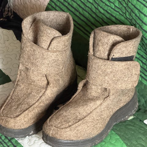 Sisällä lämmin karvavuori ja pohjana paksu kumi. Sisällä huopapohja.