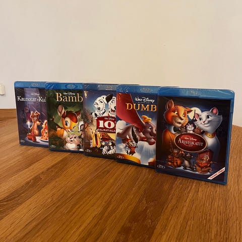 Disney Blu-ray -elokuvakokoelma. Kokoelmassa useita Walt Disney -animaatio- ja live action -elokuvia suomalaisilla kansilla, kuten Leijonakuningas, Dumbo, Pieni merenneito ja Lumikki ja seitsemän kääpiötä. Elokuvat ovat sinisissä Blu-ray-koteloissa. Sopii Blu-ray-soittimelle ja sisältää useita lasten ja koko perheen elokuvia samassa paketissa.