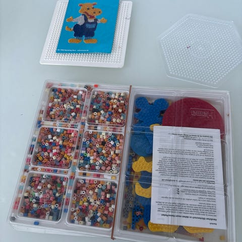 Hama-helmirasia lasten askarteluun. Isot helmet. Toinen rasia reilu puolet helmiä täynnä. Toisessa rasiassa 6 erilaista muottia+ohjeita.