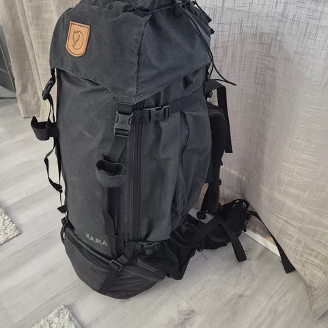 Fjällräven Kajka 75. Tilava ja kestävä rinkka, mukava kantaa isossakin kuormassa. Ikää on n. 15 vuotta, mutta käyttökertoja sinä aikana kertynyt liian vähän.