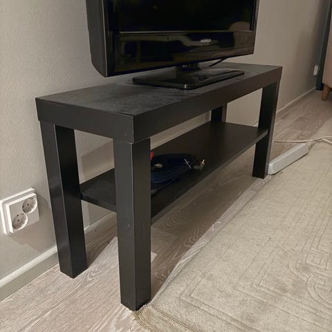 Musta Ikean TV taso. Elämää nähnyt on kolhuja ja naarmuja.