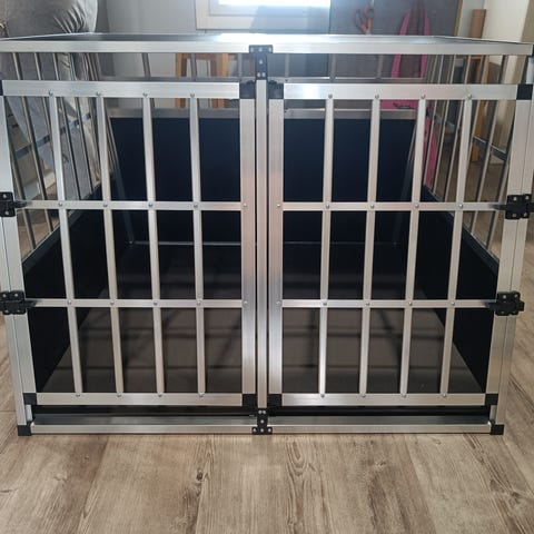 Boxissa on kalteva takaseinä, ritilärakenne yläosassa ja ovessa sekä umpipaneelit sivuilla ja takana. Ovessa mekaaninen salpamekanismi.