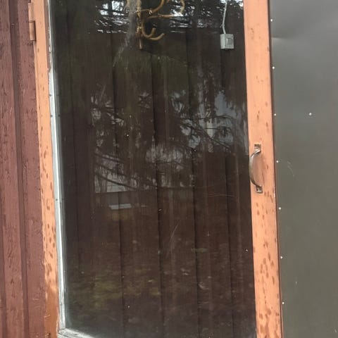 Valkoinen ulko-ovi, jossa yläosassa lasiaukot ja koristeellinen paneelointi alaosassa. Sarannat vasemmalla.