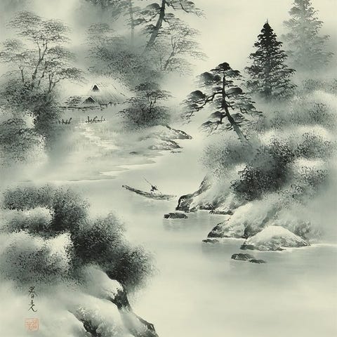 Tämän Chinnenin (椿年) tekemän riippuvan rullamaalauksen kautta esitetään pohdiskeleva Sansui (山水) -maisema, jossa sumuisiin rotkoihin, kiemuraisiin virtoihin ja kerrostuneisiin vuoristoketjuihin kietoutuu salainen erakko, piilossa puiden ja kivien keskellä. Teoksen koostumus kehittyy pehmeässä mustavalkoisessa musteessa, ohjaten katsojan katseen ilmamaisen syvyyden ja tilankulun rytmin läpi. Negatiivisen tilan ja hienon siveltimenvedon välinen vuorovaikutus herättää tunteen yksinäisyydestä, ajattomuudesta ja harmoniasta luonnon kanssa. Allekirjoitettu ja kuvasinetty “Chinnen” (椿年), rullamaalaus heijastaa kirjallinen-elitistit ideaa vetäytymisestä ja itsereflektoinnista, tarjoten runollisen vision luonnosta turvasatamana hiljaiselle pohdinnalle. Se on hienostunut esimerkki Edo-kauden maisemamaalauksesta, jossa visuaalinenrauha ja filosofinen syvyys kohtaavat."} } } } } } } } } }} } } } } }} } } } } } } } } } } } } } } } } } } } } } } } } } } } } } } } } } } } } } } } } } } } } } } } } } } } } } } } } } } } } } } } } } } } } } } } } } } } } } } } } } } } } } } } } } } } } } } } } } } } } } } } } } } } } } } } } } } } } } } } } } } } } } } } } } } } } } } } } } } } } } } } } } } } } } } } } } } } } } } } } } } } } } } } } } } } } } } } } } } }椿年 Chinnen – japanilaista taidetta, kakejiku (kakemono) – seinäriipustus. / Sumuinen rotko, vuoret, joet, Hermitage. Sansui-maisematallekirjoituksella ja leimalla 'Chinnen' 椿年Kokonaiset mitat: 24,5" W x 78,9" H / 62,3 cm x 200,5 cmSisämitat: 16.6" W x 50.6" H / 42.2cm x 128.7cmMateriaali: SilkkiKäsinmaalattuRullan päät: PuuPaino: 420 gEhtoAntiikkiesineissä on alun perin taitoksia, läikkiä, vaurioita ja muuta. Viittaan mielelläni ilmoituksen kuviin, mutta ymmärräthän, että kaikkien kuntojen näyttäminen kuvilla on vaikeaa. Erityishuomiot: LÄIKKÄ hieman, TAITOS hieman, VAURIO hieman, TAITE, KAAREVUUS, LÄIKKÄVAURIO kiinnityksen takana.ToimitusILMAISET TOIMITUKSET kaikkialle maailmaan rekisteröidyllä kirjeellä, EMS:llä tai DHL:llä.