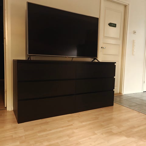 Hyväkuntoinen Ikean neljän vetolaatikon Malm-lipasto. Joitain pieniä elämisen jälkiä lipaston alaosassa ja alimmassa vetolaatikossa, näkyy kuvissa.