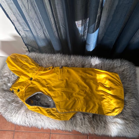 Rukka koiran sadetakki, koko 40. Kauluksessa kiristysnyörit ja takajaloille kumilenkit. Aika pienelle koiralle sopiva, ollut mopsilla.