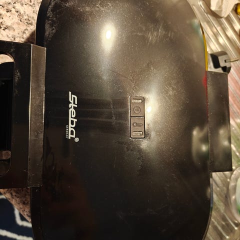 Belgialainen vohvelirauta Steba Volcano, musta. Tekee 4 belgialaista vohvelia kerrallaan. Tarttumaton Non-stick-pinnoite, jolloin tarvitsee vähemmän rasvaa (Low fat) helppo puhdistaa, päältä täytettävä suppilo huolehtii, että aina oikea määrä ja ettei taikina valu yli. Tilaa säästävä vertikaali malli. Muutaman kerran käytetty.