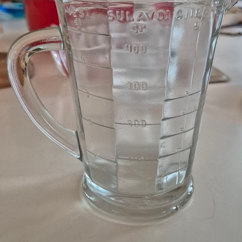Puolen litran lasinen mittakannu aikojen takaa, valmistaja Riihimäen Lasi. Jotain käytön jälkiä on, kuten kuvissa näkyy. Pohjassa myös ilmakupla. EHJÄ