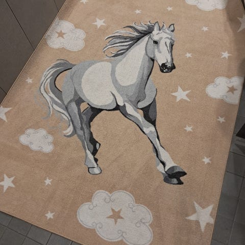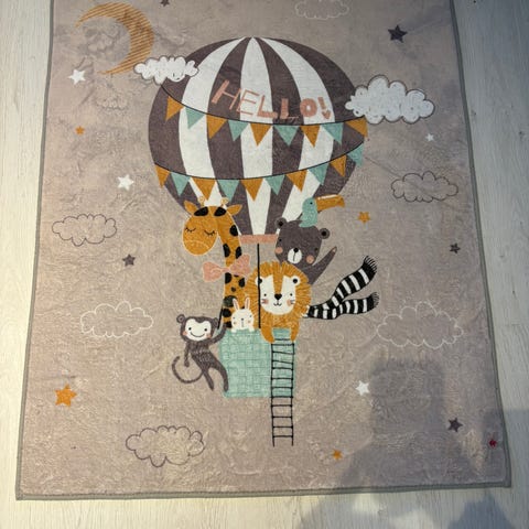 lasten matto, jossa auton muotoinen ja -aiheinen kuvio. Matto on kapea ja pitkä, sopii esimerkiksi lastenhuoneeseen leikkialueen tai sängyn viereen. Värit ovat vaaleat ja tummat sävyt, reunus tummempi. Materiaali ei tarkemmin tiedossa, mutta pinta on tasainen ja kuvioitu.
