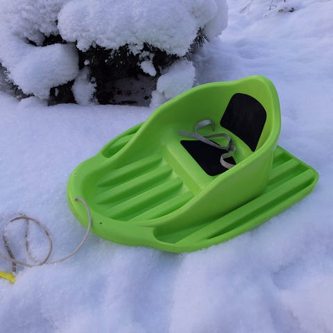 Punainen siistissä kunnossa oleva Stiga Cruiser -vauvapulkka. Turvavyötä ei pulkassa ole.