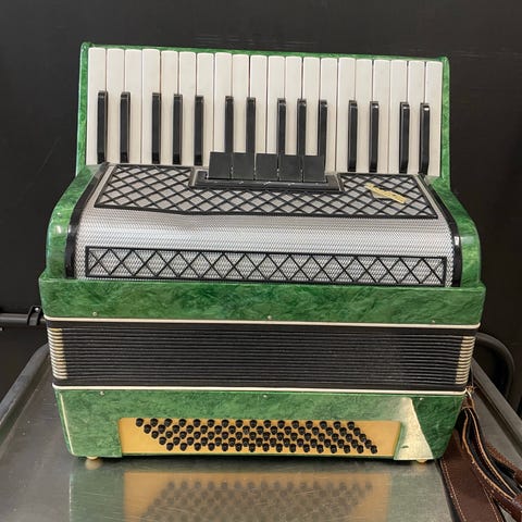 Record 45 harmonikka. Soittimessa on pianokoskettimisto ja useita äänikertanappeja. Harmonikka on pääosin musta, palkeissa vihertävä sävy. Mukana olkahihnat kantamista varten.