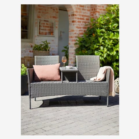 Polyrottinkinen parvekepenkki, jossa kaksi istuinpaikkaa ja keskelle integroitu nouseva pöytälevy. Väri beige. Soveltuu parvekkeelle tai terassille ulkokäyttöön. Runko ja punos muovimateriaalia, pöytälevy puunsävyinen. Penkissä käsinojat molemmilla sivuilla ja korkeat selkänojat istuinmukavuuden tukena.
