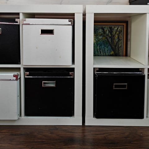 Hyllyssä 2x kaappi ja 1x laatikosto