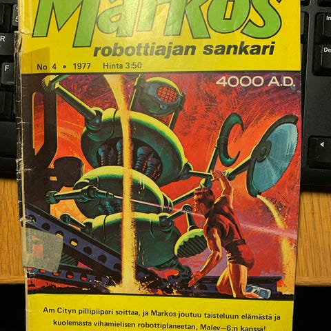 Markos robottiajan sankari sarjakuvalehti. Suomikielinen sarjakuvakirja, jonka kannessa seikkailuteemainen kuvitus futuristisessa kaupunkiympäristössä. Tuote sopii sarjakuvien ja vanhempien seikkailusarjakuvien keräilijälle tai lukijalle. Pala kannesta pois