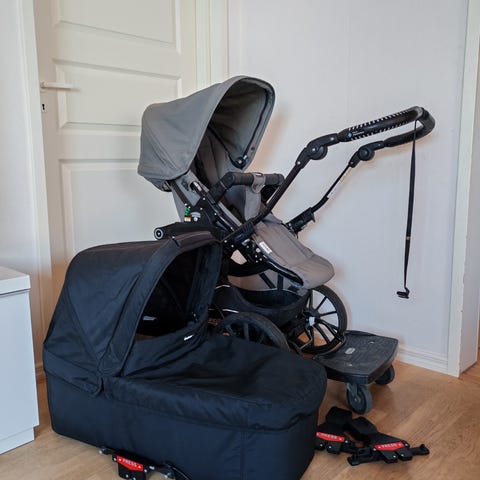 Mukaan tulee myös sadesuoja (jossa kuminauhat lyöstyneet) ja hoitolaukku (ja siihen kuuluva hoitoalusta).