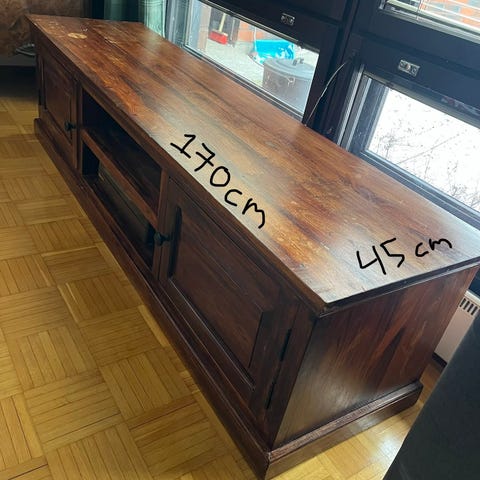Puinen tv-taso, jossa kaksi vetolaatikkoa toisella sivulla ja avohyllytila keskellä ja toisella sivulla. Tasossa on rustiikkinen, käsittelemättömän tai kevyesti käsitellyn puun ilme. Soveltuu television ja viihde-elektroniikan sijoittamiseen sekä säilytystilaksi esimerkiksi kirjoille, lehdille tai peleille. Taso sijoitetaan lattialle seinän viereen. Tämä on keskeneräinen entisöintiprojekti, eteenpäin tällaisenaan, projektiksi tai vaikkapa maalaukseen.