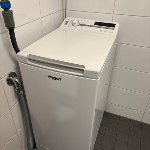 Myynnissä Whirlpool AWE5080 päältä täytettävä pesukone. Pesukoneessa on ylhäältä avattava kansi ja rumpu.